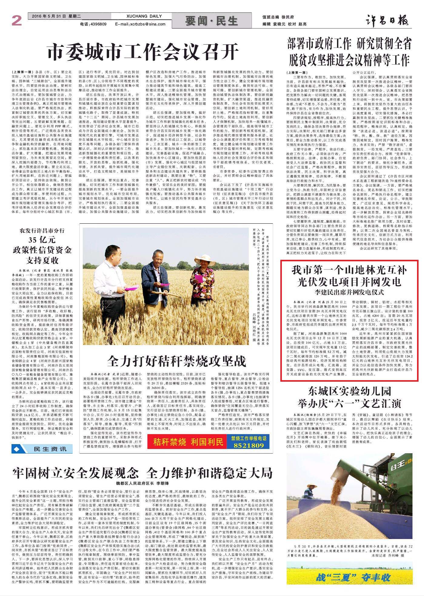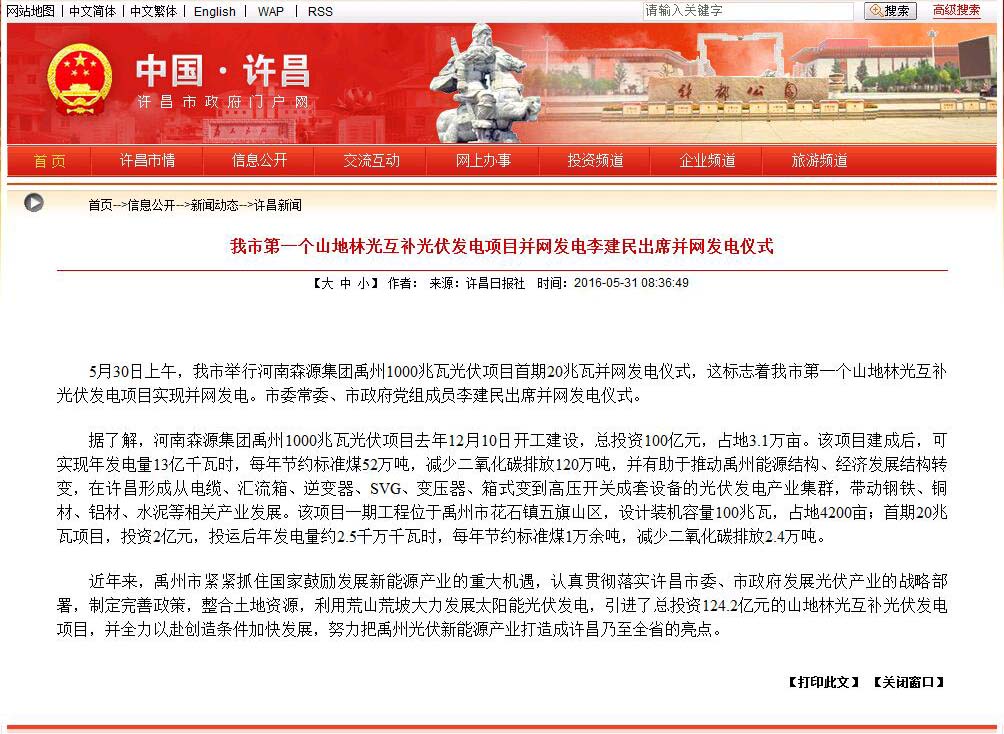 许昌日报/许昌市人民政府门户网站/许昌电视台——我市第一个山地林光互补光伏发电项目并网发电 李建民出席并网发电仪式